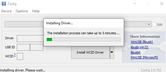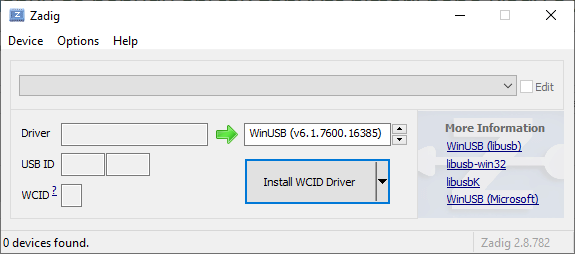 2) Na těchto stránkách si stáhneme prográmek s názvem Zadig 2.8, který si po stažení spustíme. Zde se nám v seznamu objeví náš minidisk a my mu následně nainstalujeme ovladač, aby nám ho Windows vůbec dokázaly rozpoznat.
