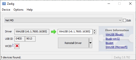 1) Minidisk samozřejmě musíme USB kabelem připojit k počítači, což ví každý. Co ovšem každý neví je fakt, že v současných systémech Windows se horkotěžko dá sehnat správný a funkční ovladač. Takže po připojení se minidisk možná probere, ale nic extra s ním neuděláte. Proto si v internetovém prohlížeči najdeme stránku Zadig.